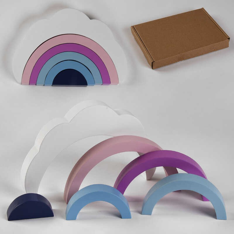 ">Красивая деревянная радуга С 47864 привлечет ребенка в первые минуты и принесет много радости и улыбок! 6 дуговых вкладышей вместе создают логическую пирамидку в форме нежной радуги в розовых и голубых оттенках. Цветные детали игрушки помогут ребенку улучшить цветовосприятие, сенсорно-зрительную координацию, мелкую моторику рук, смогут развить усидчивость, концентрацию и внимательность, а также улучшат образное и творческое мышление. Все фрагменты изготовлены из высококачественной древесины и тщательно отшлифованы, поэтому полностью безопасны. Игровые элементы покрыты нетоксичными пастельными цветами, которые доставляют эстетическое удовольствие.