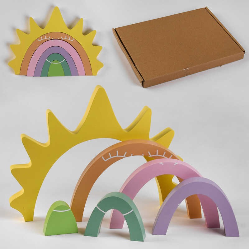 Красивая деревянная радуга С 47863 привлечет ребенка в первые минуты и принесет много радости и улыбок! 6 дуговых вкладок вместе создают логическую пирамидку в форме нежной радуги с улыбкой и лучистым солнышком. Цветные детали игрушки помогут ребенку улучшить цветовосприятие, сенсорно-зрительную координацию, мелкую моторику рук, смогут развить усидчивость, концентрацию и внимательность, а также улучшат образное и творческое мышление. Все фрагменты изготовлены из высококачественной древесины и тщательно отшлифованы, поэтому полностью безопасны. Цветные участки покрыты нетоксичными пастельными цветами, которые доставляют эстетическое удовольствие.