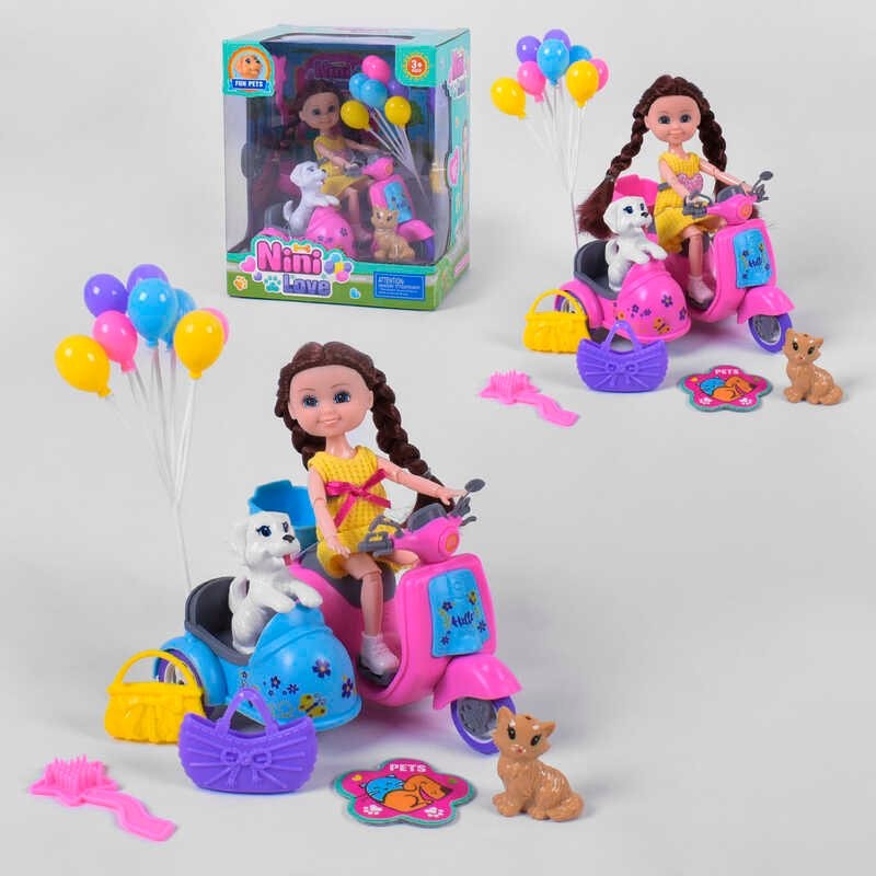 В комплект входит куколка, которая передвигается по миру на своем розовом скутере в вместе с питомцами. Розовый скутер оснащен креплениями для рук и подставками для ног, а сбоку расположилась коляска для перевозки.
