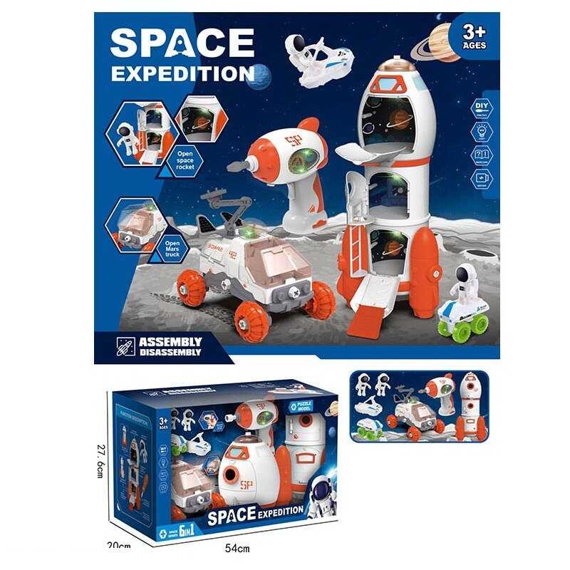 Набор космоса 551-1 (8/2) марсоход, электрический шуруповерт, ракета, 2 фигурки космонавтов, 2 вида мини-транспорта, подсветка