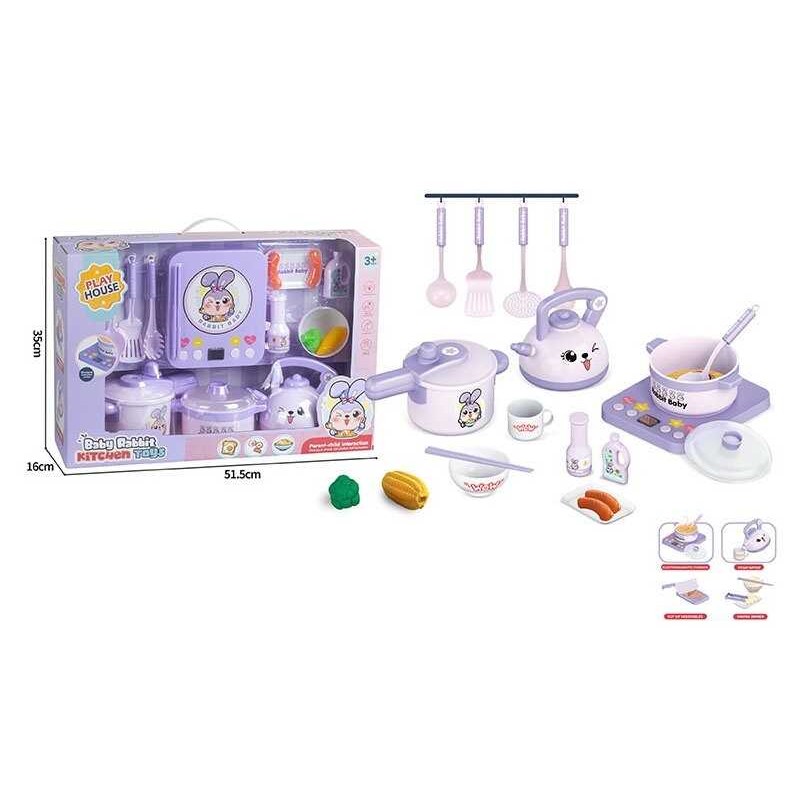 Цветной набор посуды Baby Rabbit предназначен для маленьких поваров, которые только знакомятся с кулинарным миром! Яркая, детализированная и реалистичная - эта игрушечная посуда способна вдохновить любого ребенка! Набор включает 11 элементов, среди которых есть и варочная поверхность, с активными кнопками, симулирующими работу настоящего аналога. Набор поможет ребенку познакомиться с основными принципами работы на кухне, пофантазировать по теме рецептов, а также почувствовать себя настоящим шеф-поваром. Присоединяйтесь к игре вместе с ребенком и создавайте кулинарные шедевры вместе! Особенности: – набор включает 18 элементов; - выполнен в яркой цветовой гамме, приятной для глаз ребенка; - отличается высоким качеством исполнения и отличной детализацией; - варочная поверхность работает от 3 батареек типа АА (в комплект не входят); - выполнен из прочного пластика. Комплектация: - варочная поверхность; - кастрюля с крышкой; - пароварка; - чайник; - поднос; - лопатка, шумовка, половник; - палочки для еды; - продукты; - 2 бутылки со специями.">Цветной набор посуды Baby Rabbit предназначен для маленьких поваров, которые только знакомятся с кулинарным миром! Яркая, детализированная и реалистичная - эта игрушечная посуда способна вдохновить любого ребенка! Набор включает 11 элементов, среди которых есть и варочная поверхность, с активными кнопками, симулирующими работу настоящего аналога. Набор поможет ребенку познакомиться с основными принципами работы на кухне, пофантазировать по теме рецептов, а также почувствовать себя настоящим шеф-поваром. Присоединяйтесь к игре вместе с ребенком и создавайте кулинарные шедевры вместе! Особенности: – набор включает 18 элементов; - выполнен в яркой цветовой гамме, приятной для глаз ребенка; - отличается высоким качеством исполнения и отличной детализацией; - варочная поверхность работает от 3 батареек типа АА (в комплект не входят); - выполнен из прочного пластика. Комплектация: - варочная поверхность; - кастрюля с крышкой; - пароварка; - чайник; - поднос; - лопатка, шумовка, половник; - палочки для еды; - продукты; - 2 бутылки со специями.Характеристики