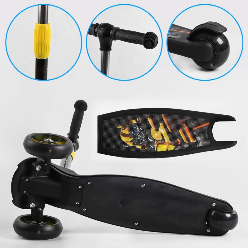 Конструкция самоката состоит из трех колес – два передних и одно заднее. За счет материала из которого изготовлены все три колеса данной модели - полиуретан – самокат бесшумный, а езда на нем мягкая и комфортная. Все три колеса во время движения светятся разноцветными цветами. Диски передних колес излучают дополнительную подсветку во время езды.