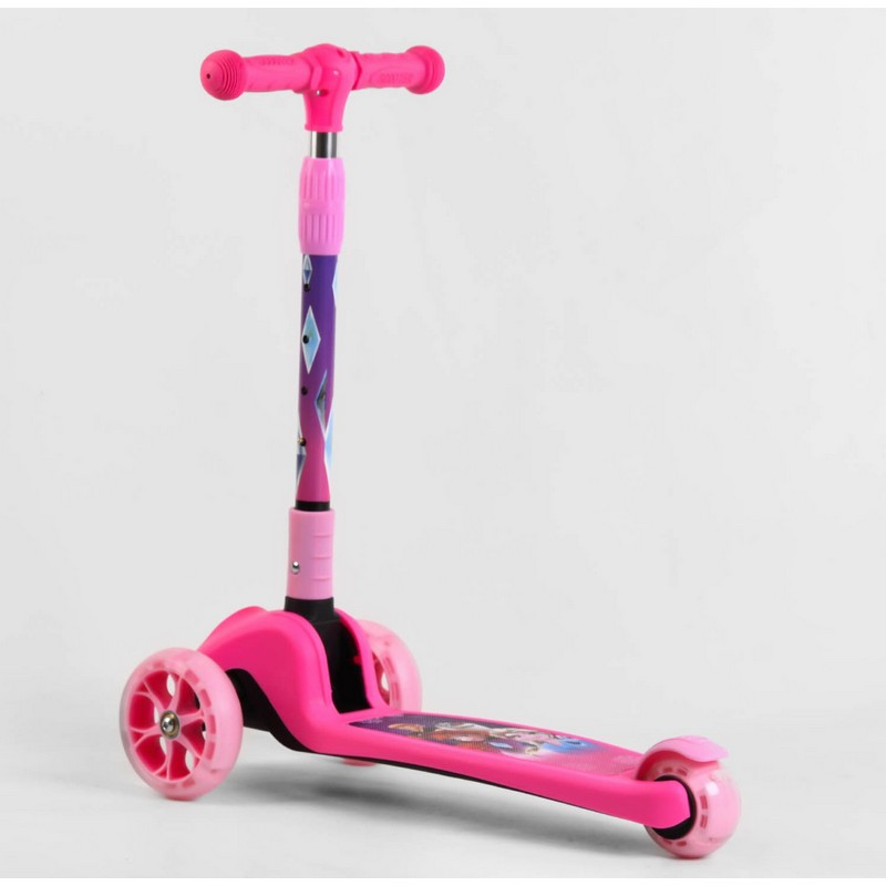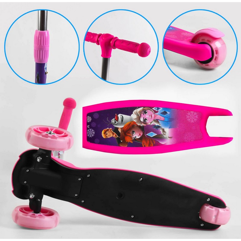 Конструкция самоката состоит из трех колес – два передних и одно заднее. За счет материала из которого изготовлены все три колеса данной модели - полиуретан – самокат бесшумный, а езда на нем мягкая и комфортная. Все три колеса во время движения светятся разноцветными цветами. Диски передних колес излучают дополнительную подсветку во время езды.