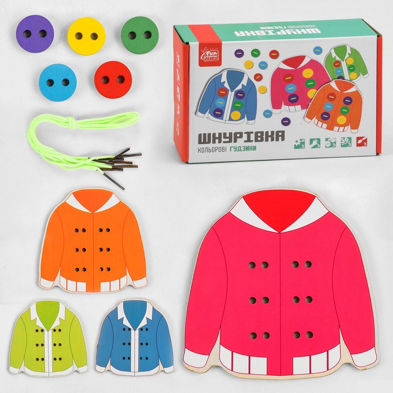 Развивающая деревянная игра "Шнуровка Цветные пуговицы" от производителя развивающих детских игрушек "Fun Game club" станет прекрасным обучающим пособием для малышей, которые учатся завязывать узелки и знакомятся с шитьем.