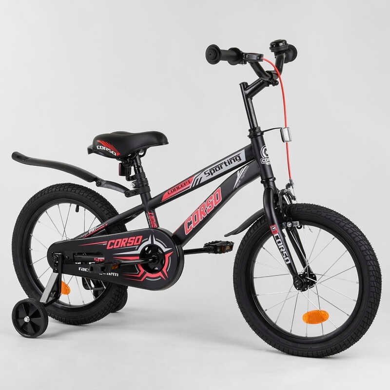 Детский двухколесный велосипед Corso 16`` предназначен для юных велосипедистов!Новая спортивная рама велосипеда, новый дизайн, его комплектация и надежная конструкция сделают прогулки на свежем воздухе активными и безопасными.